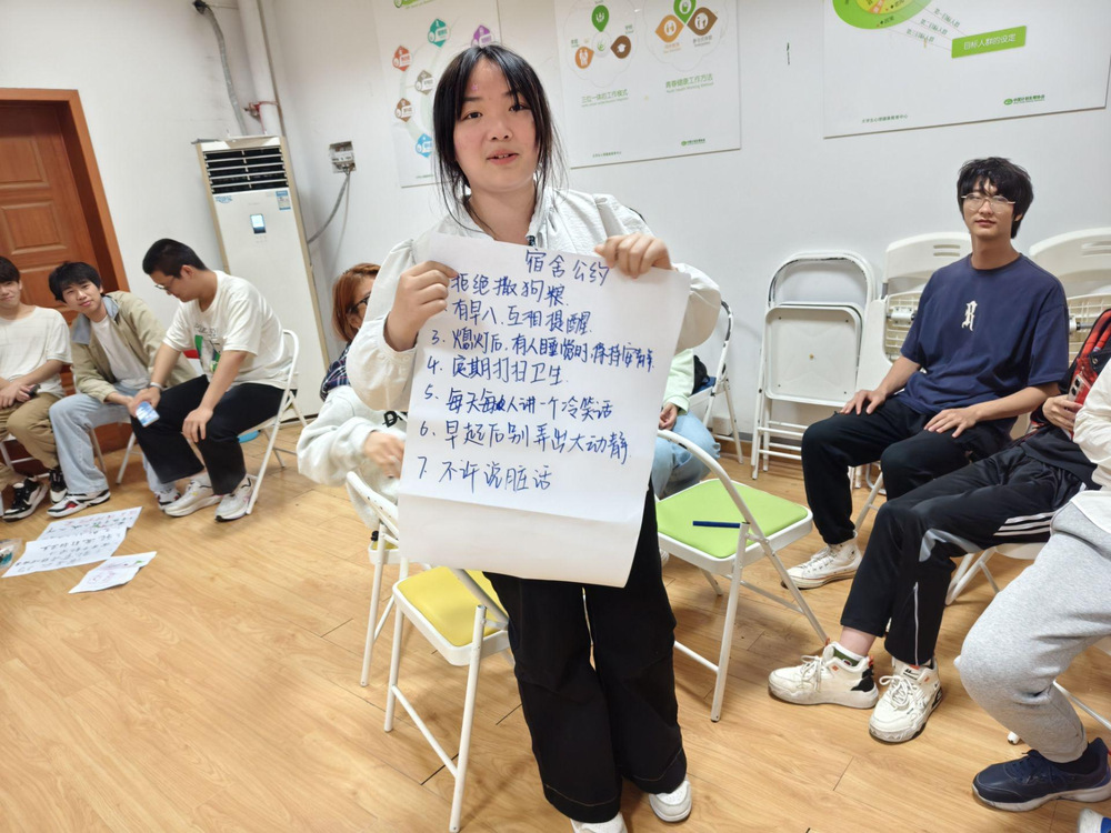 活动伊始,主持人通过轻松愉快的“特征接龙”“特色名片”环节,让同学们分享了个人兴趣爱好及舍友的生活习惯,加深了彼此了解。在情景剧场环节中,各组同学抽取宿舍矛盾话题,极力构思剧情,通过角色扮演生动演绎冲突场景,并运用“非暴力沟通”技巧提出解决方案。随后,同学们根据宿舍生活中遇到的实际问题,共同制定了《宿舍关系公约》,明确了尊重边界、情绪处理和共同仪式等原则,为构建和谐宿舍提供了行动指南。