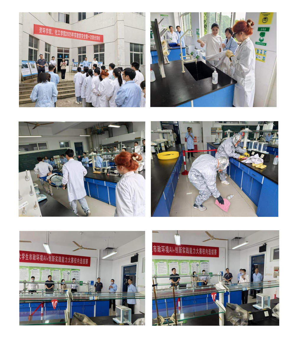 开幕式结束后,安全应急演练项目在14-208环境工程实验室正式开始,参与演练的人员由资源与环境工程学院和化工学院两个学院实验老师、24级研究生、23级本科及演练总指挥杨廷海等人组成,演练科目为:氢氟酸泄漏事故应急处置,演练内容通过伤员救治,事故现场处置等环节展示应急处理的指挥体系和处置流程及专业要点。分析测试中心全体人员、资环学院及化工学院全体实验员、24级研究生全程观摩。
