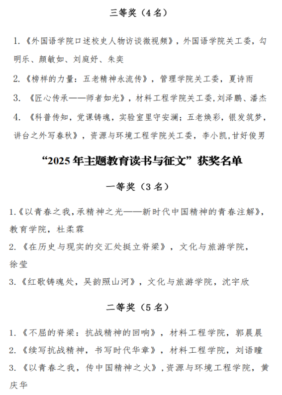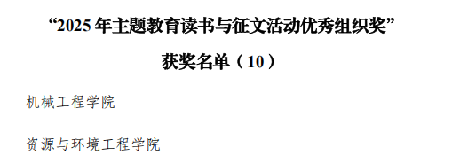 在2025年“读懂中国”活动中,我院李小凯、甘好俊男、明航同学共同创作并参与的微视频、短视频及舞台剧作品《科普传知,党课铸魂,实验室里守安澜;五老焕彩,银发筑梦,讲台之外写春秋》荣获三等奖,资源与环境工程学院荣获“争优创先奖”。此外,在9月19日校关工委公布的《关于2025年主题教育读书与征文活动获奖名单的通知》中,我院学子黄庆华同学的作品《以青春之我,传中国精神之火》荣获征文二等奖,朱守旺同学的作品《〈不屈的脊梁〉:铭记烽火岁月,传承不屈精神》荣获征文三等奖。我院关工委荣获“优秀组织奖”。