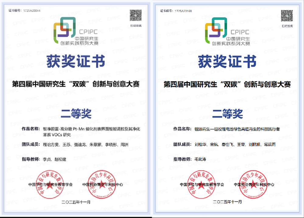 本届大赛吸引了全国377所高校及科研院所的4999支队伍、近2.6万名师生参与,经初赛严格选拔后,仅371支团队晋级决赛,赛事规模与竞争激烈程度均创历史新高。“芳界领航”团队(成员:程治方斐、王苏、强迪龙、朱薏蒙、李晓彤、周洲;指导教师:李贞、赵松建)聚焦工业VOCs减排的催化剂技术,在与985名校项目的比拼中,以二等奖总分第一的成绩脱颖而出。“万物新生” 团队(成员:刘楷华、宋航、秦怡飞、刘鹏旭、王莹、常涵屿;指导教师:毛武涛)的退役锂电池循环工艺,也在强手云集的决赛中脱颖而出。