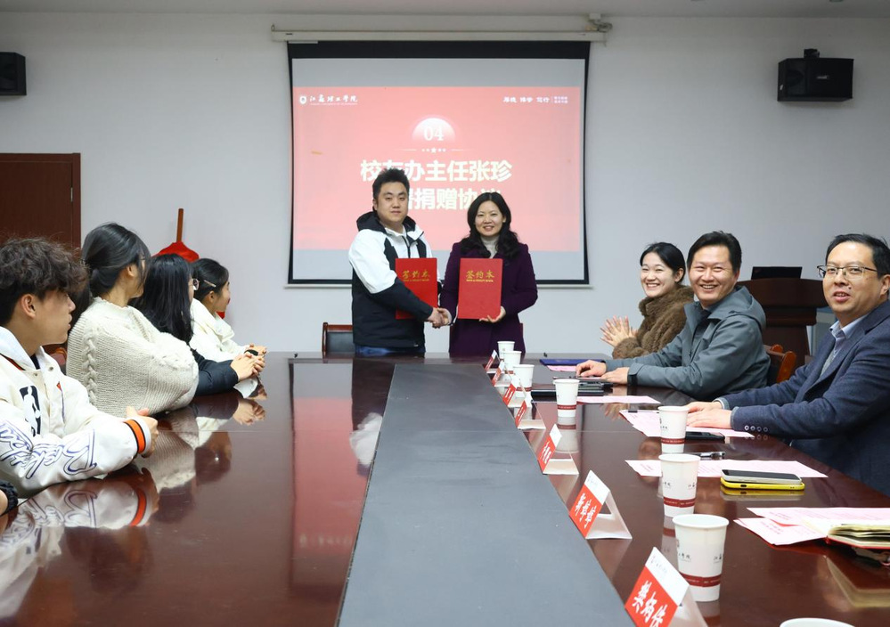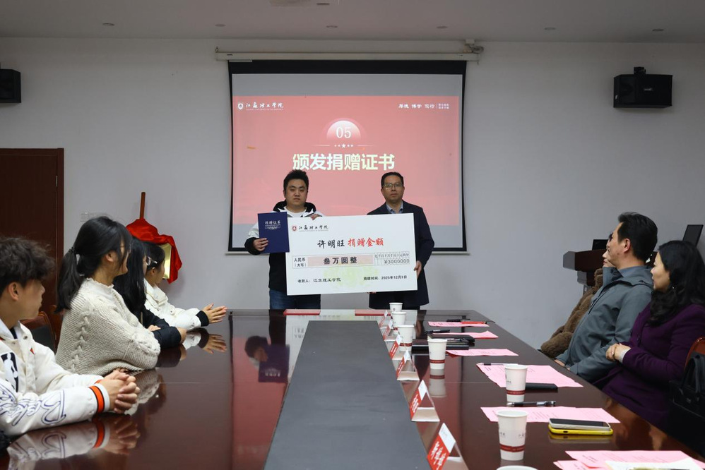 在捐赠环节,许明旺与张珍共同签署了捐赠协议,并向学校递交了捐赠支票,王俊代表学校接受捐赠,并向许明旺校友颁发了捐赠证书,对其热心教育、慷慨助学的善举致以崇高的敬意和诚挚的谢意。