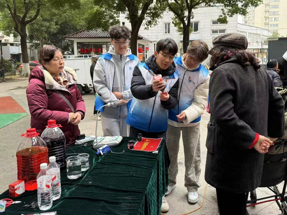 “生水易饮,久伤于内”——2022级环境科学专业学生秦浩然现场演示简易净水装置,以生动小实验引导居民直观了解水质净化过程。居民可携带家中净水器水样进行免费检测,志愿者对电导率等关键指标进行解读,并提供滤芯更换、用水隐患防范等实用建议。针对有特殊需求的家庭,团队还提供上门检测服务,切实做到“送知识上门,解难题到家”。
